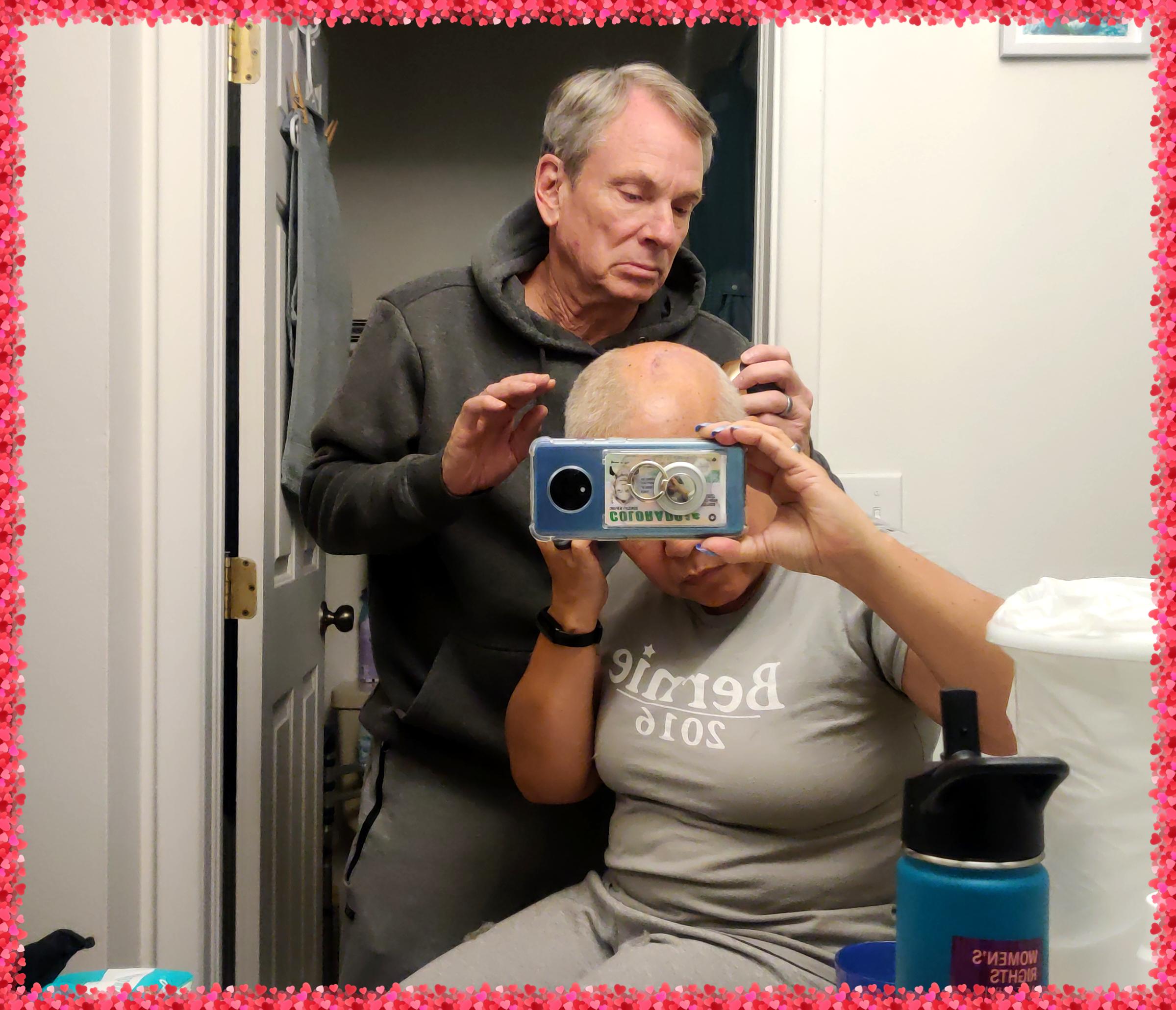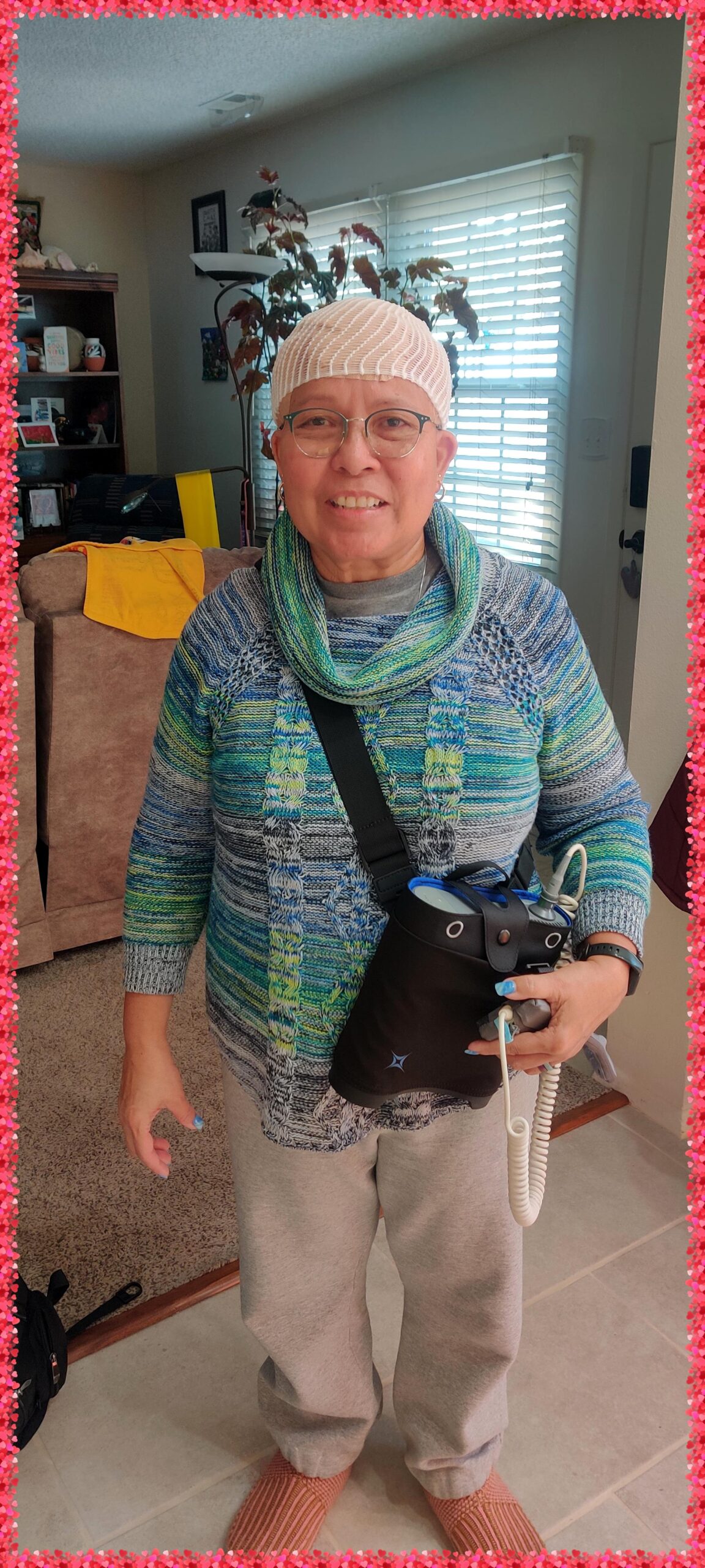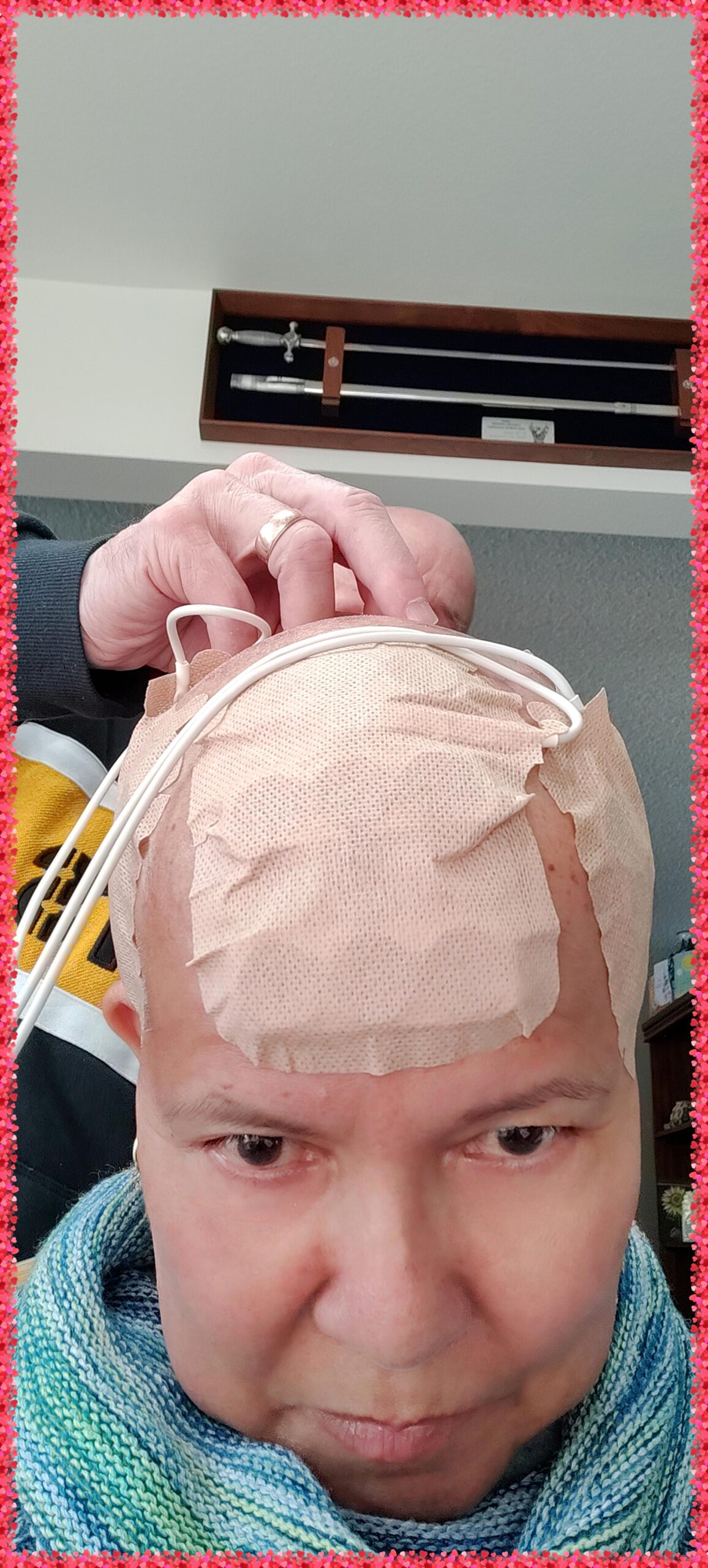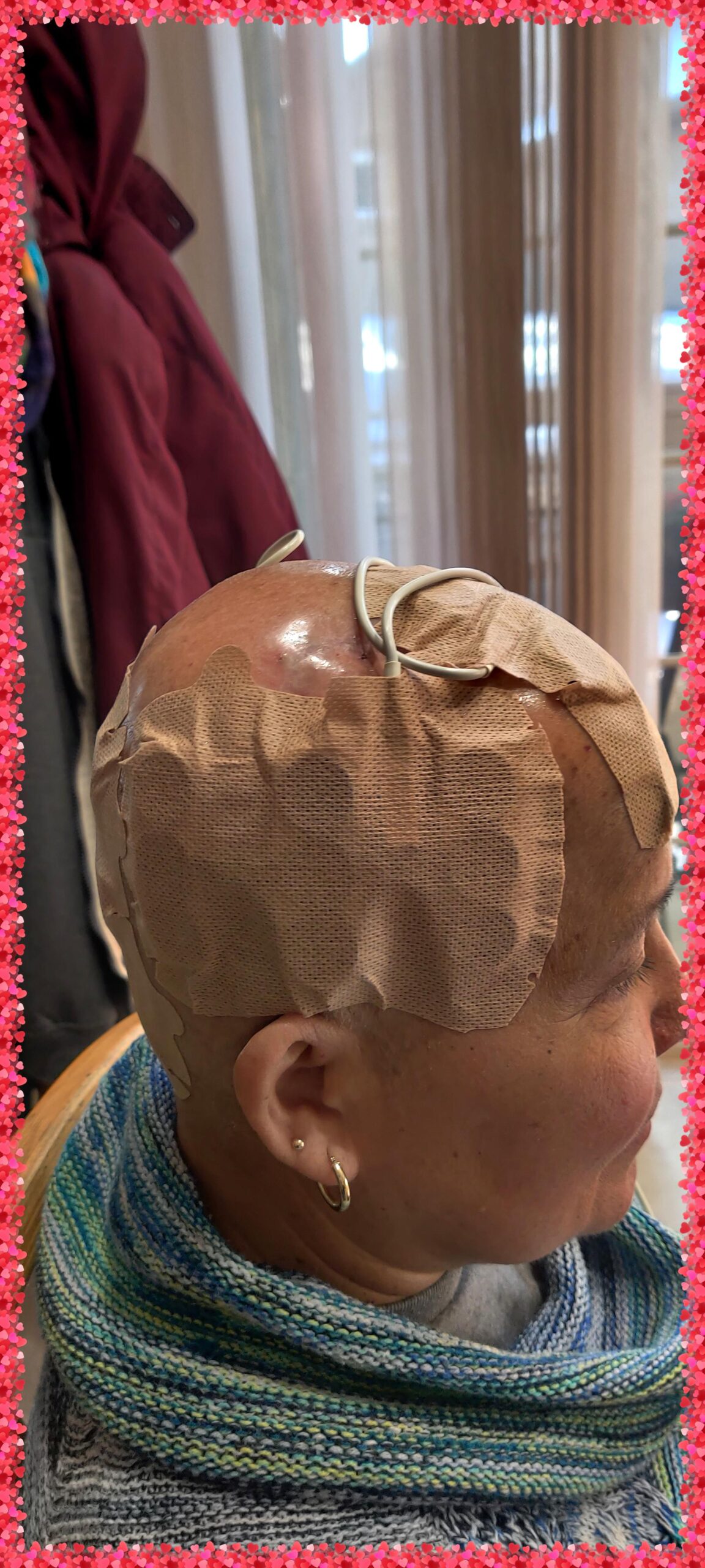 The third gallery is a collection of photos of me trying out the Novocure Optune Device This device consisted of arrays adhered to the skin, with electrical fields—known as tumor treating fields (TTFields). Unfortunately, I couldn't tolerate the discomfort and terminated the use of this device within 3 weeks.